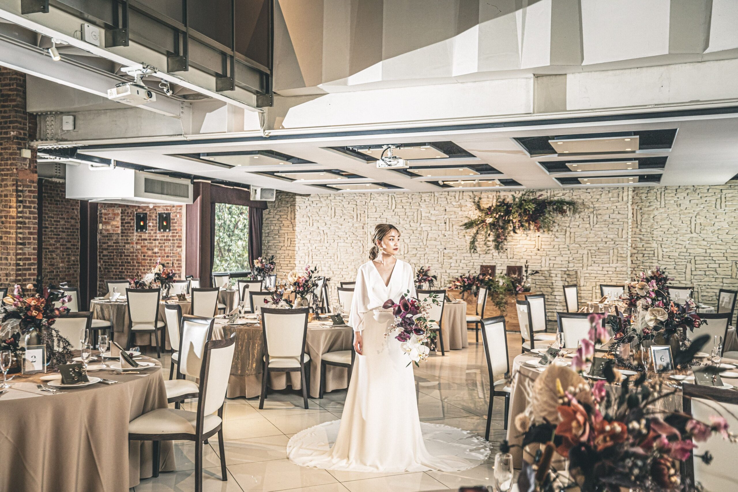 そして、和モダンな式場やナイトウェディングのように、個性が際立つロケーションでは、ドレスが物語の一部となって空間に溶け込む美しさが生まれます。