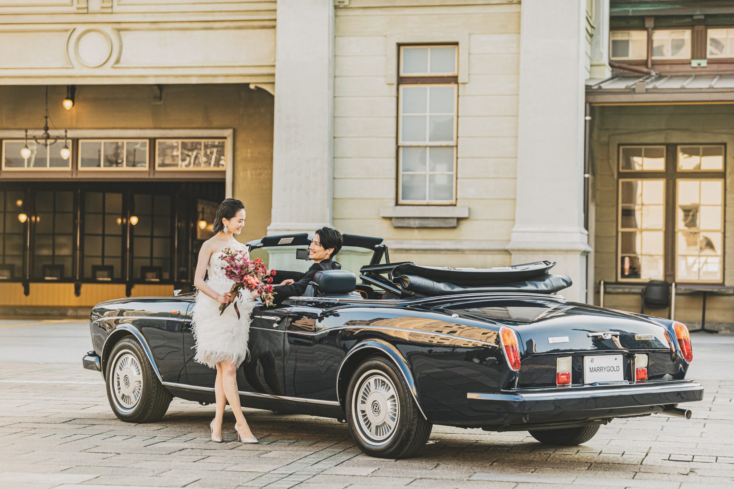 和の趣を感じる会場では、和装に寄せたエッセンスを取り入れたドレスが好相性。