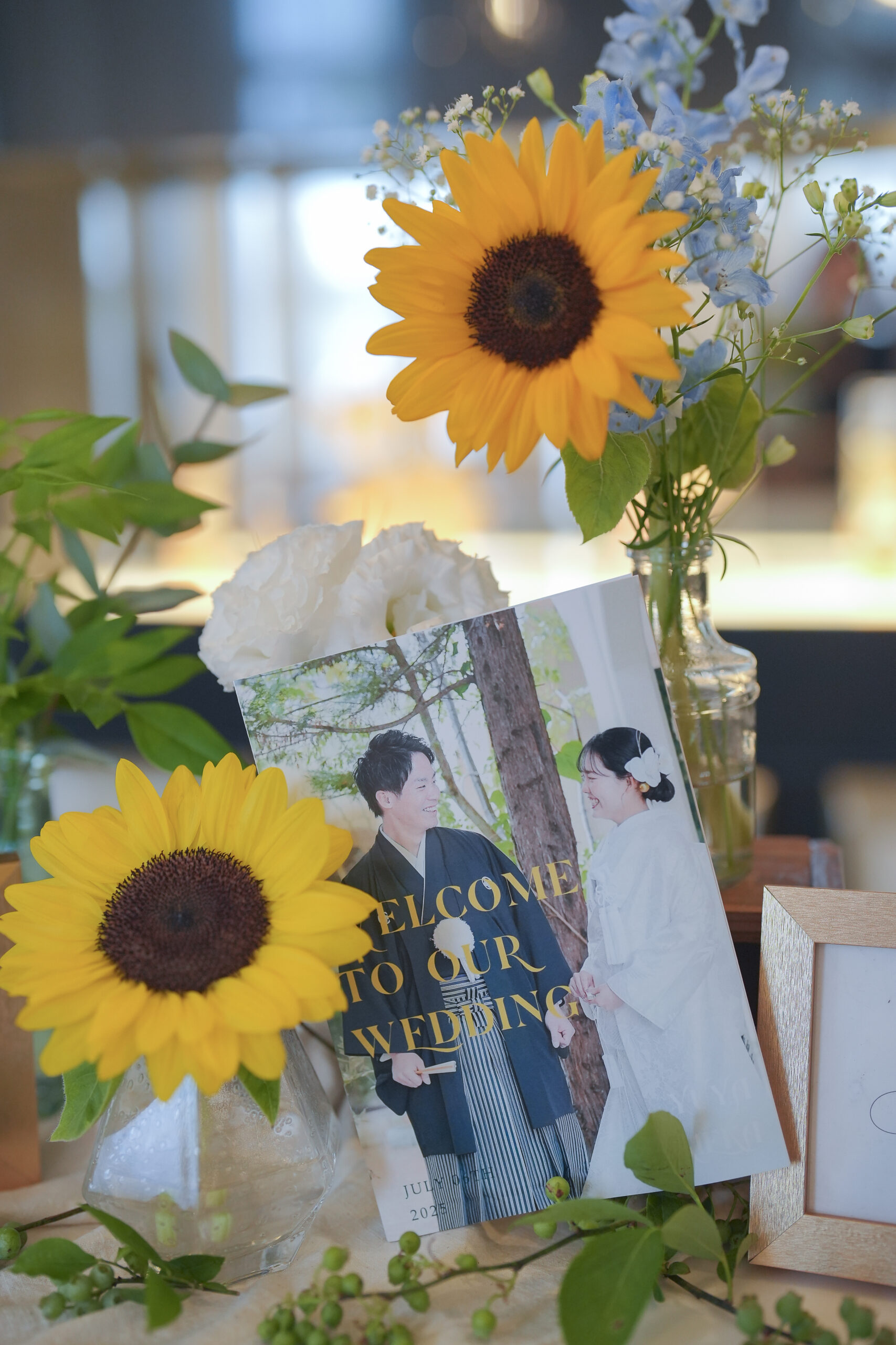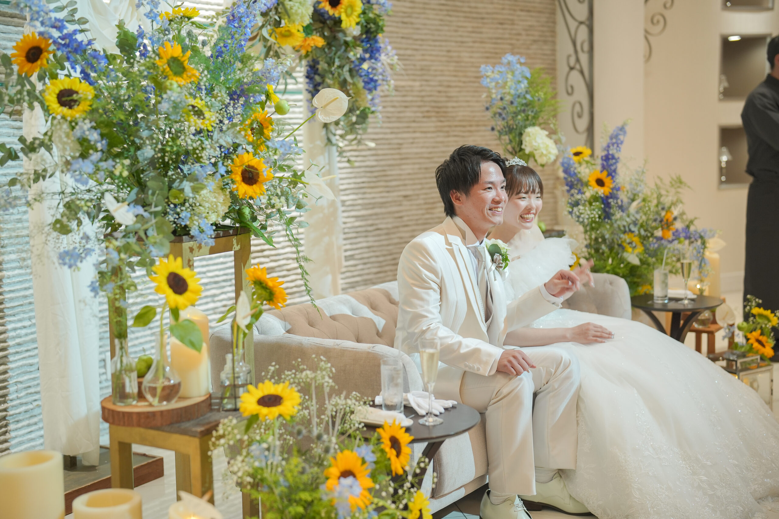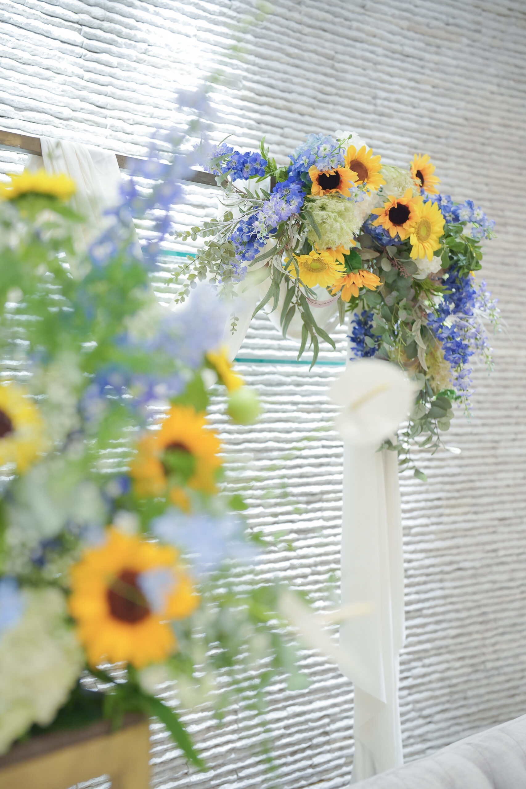 ひまわり、デンファレ、ブルースター、デルフィニウムなど明るく元気な花々が会場を爽やかに彩ります。